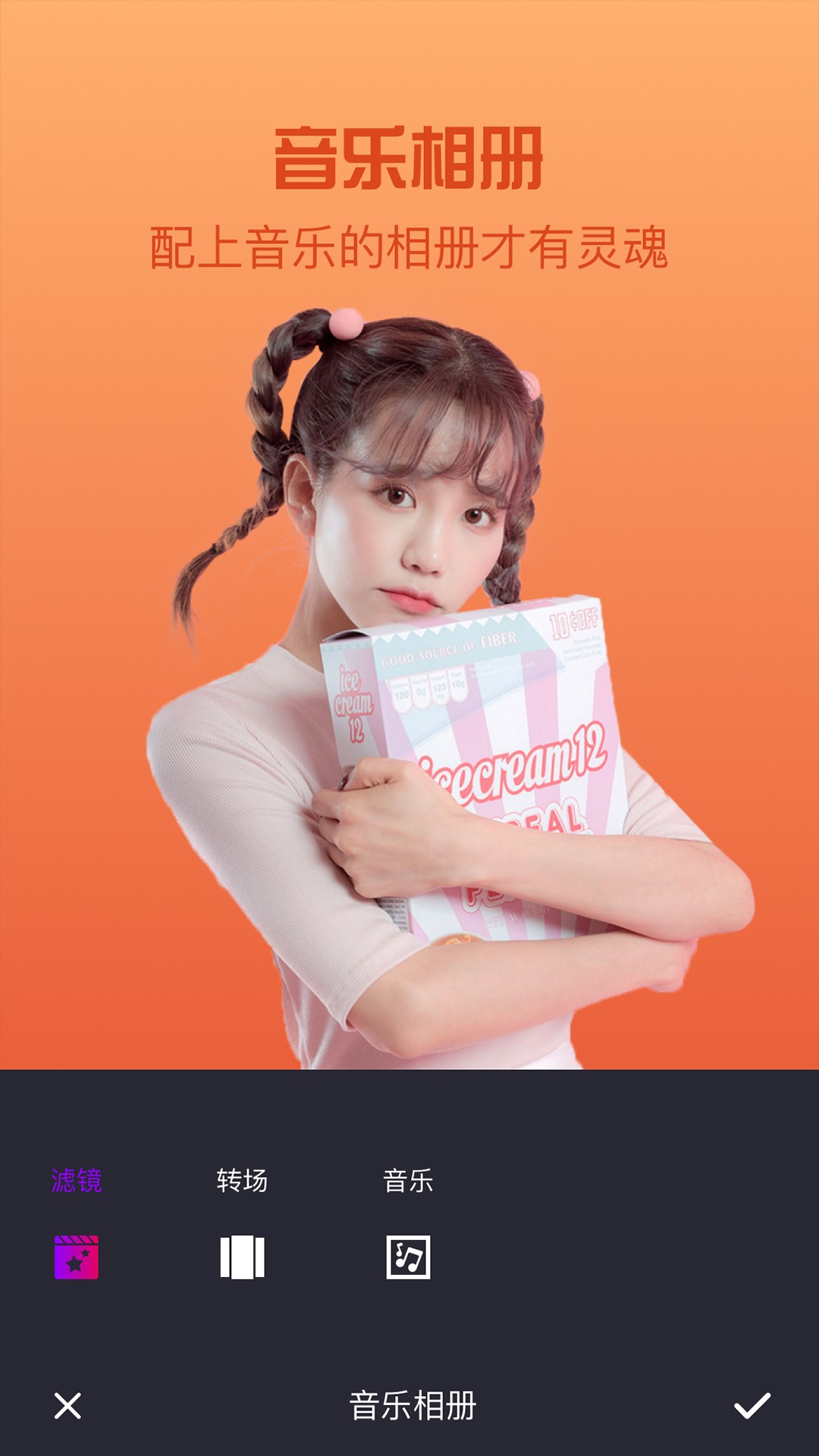 3.音乐相册丰富的滤镜、酷炫的转场,再加上你最爱的背景音乐,极简易的操作就能让简单的照片呈现大片的效果。