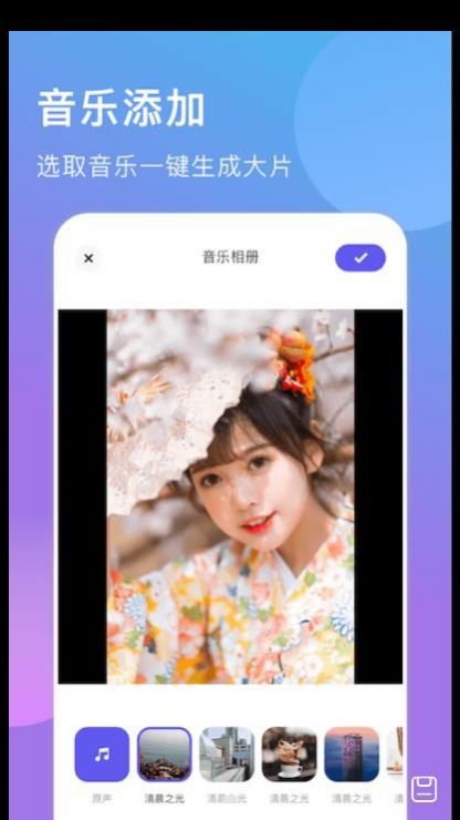 软件可以制作各种好看的相册,一键添加喜欢的照片,进行修图创作,选择好听的音效效果。