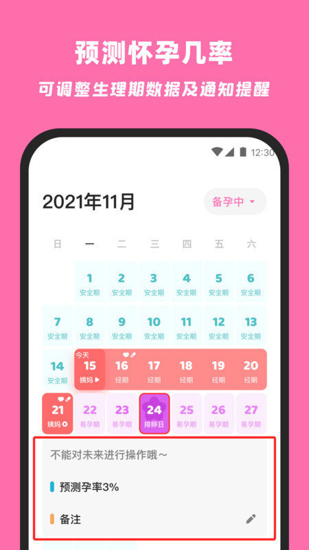 5、通过日历提醒的模式,呈现我们的月经期、备孕最佳时间等!