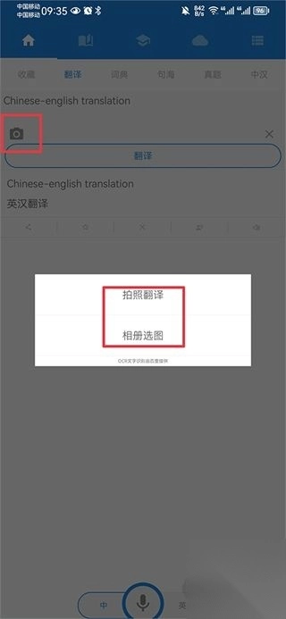 2、点击搜索框中的相机图标,然后选择拍照翻译或相册选图翻译。