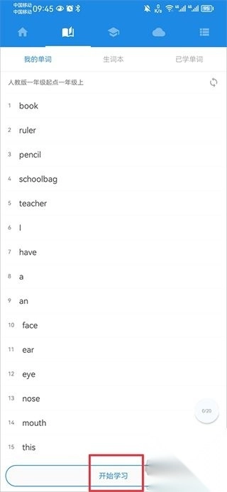 7、选择完成后,在我的单词界面中点击开始学习就可以学习到该课本中的所有单词了。