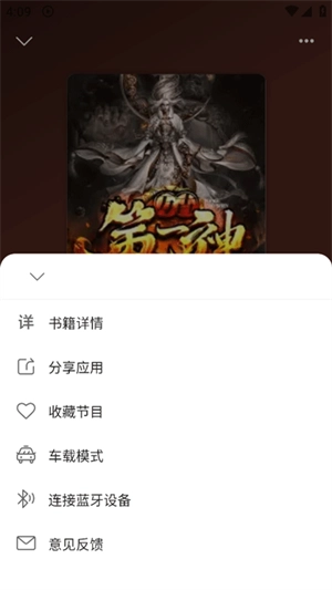 4、轻点听书页面右上角的三个小点,可查看书籍详情、开启车载模式以及连接蓝牙等。