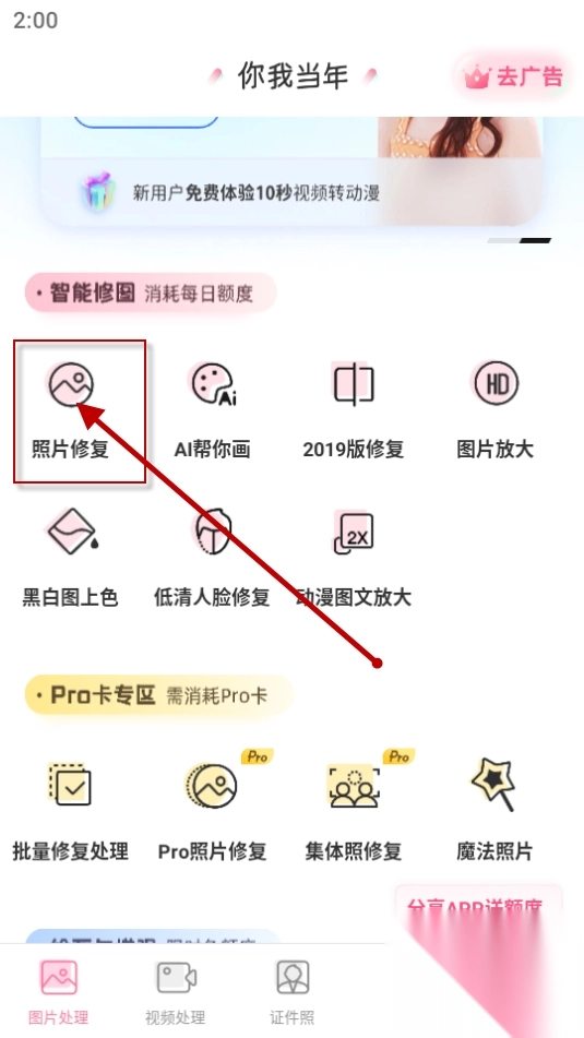 1. 在手机上下载并安装“你我当年”app,点击选择其中的照片修复功能。