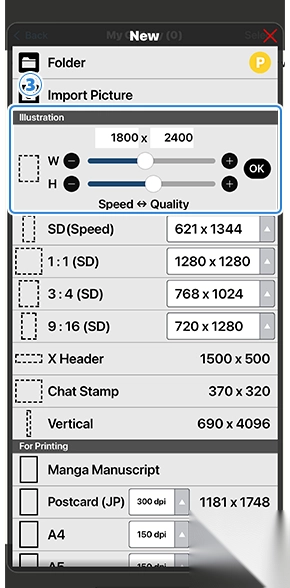 选择 ③[ 任何大小 ]。SD 大小是小画布大小,HD 大小是大画布大小。最大画布大小(像素数)因设备而异。