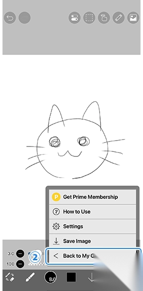 当您想要停止绘图时,请点击 ①[ 返回按钮 ] 并选择②[ 返回我的图库 ]。这将带您返回我的图库屏幕。