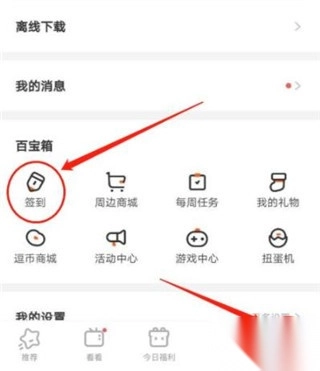 首先,找到并打开“腾讯动漫”APP。进入APP界面后,留意界面下方,点击右下角位置的“我的”选项。接着,在出现的页面中,找到“百宝箱”栏目,然后点击该栏目下的“签到”图标。