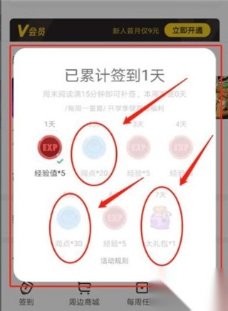 每周可以签到7天,在第2天、第5天、第7天签到时都可以领取阅点