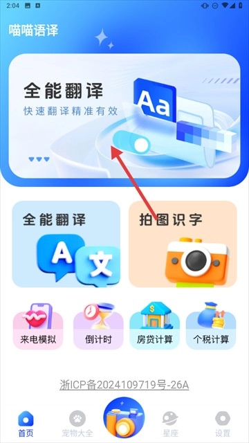 1、在首页点击【全能翻译】,即可体验精准翻译;也可以使用【拍图识字】工具;此外,还能够尝试【来电模拟】等实用工具。