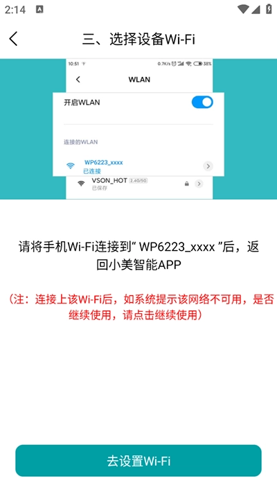 6、把手机的WiFi连接至WP6223_xxxx,随后即可连接设备。