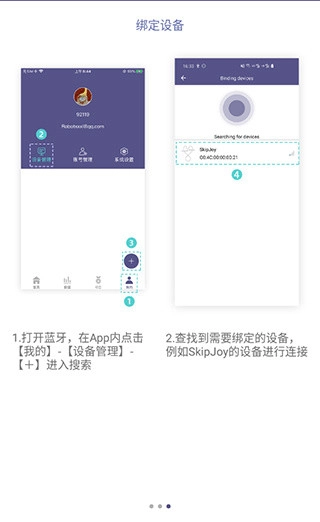 3、此外,在绑定设备的页面,能够看到绑定步骤:【打开蓝牙,在App内依次点击“我的”“设备管理”“+”,进入搜索】、【查找到需绑定的设备】。