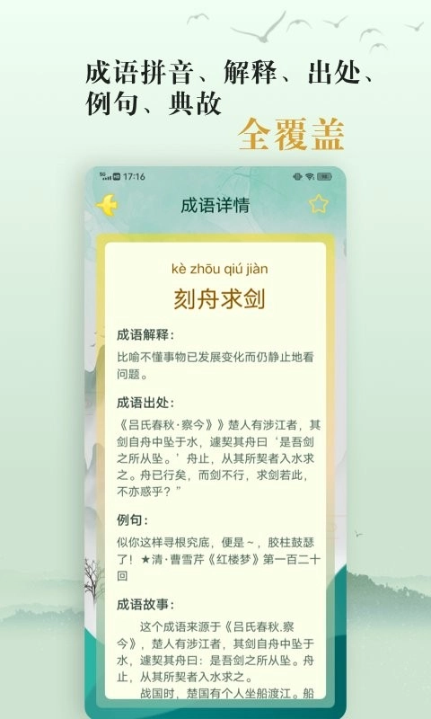 1. 内容储备充足:收纳众多常用成语,包含拼音、解释、出处以及故事等多方面信息,具备成语大词典的功能,能够满足日常学习和查询的需要,给予丰富的资源支持。
