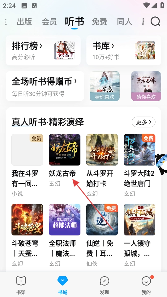 2. 在听书界面,点击《妖龙古帝》,即可进入这本书的听书页面。