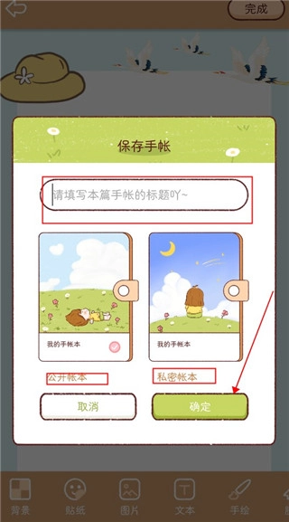 5、给手账添加标题,并且可以选择将其归为公开手账或者私密手账类别,完成操作后点击确定即可。