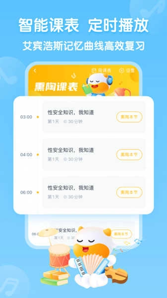 本课程广泛覆盖英语、国学等多个领域,依据记忆曲线并采用科学编排方式,全力保障学习效率与记忆的牢固程度。用户能够自主设定课表,课程的优质内容会定时自动播放,助力孩子培养良好的听学习惯。