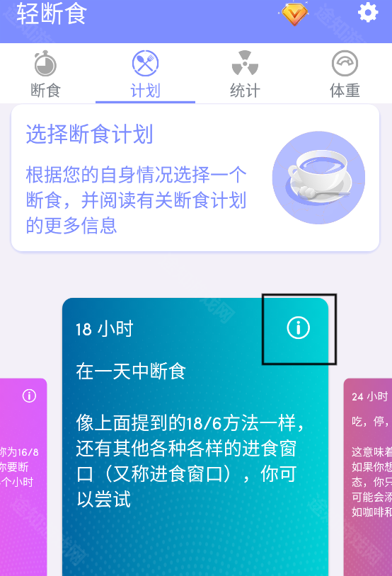 1. 打开软件后,第一步是在计划栏挑选一个契合自身身体状况的断食计划。这里有12小时、16小时等各类科学计划可供选择,你也能依据自身实际情况定制专属计划。点击各计划右上角的感叹号图标,就能了解该断食计划的科学阐释。