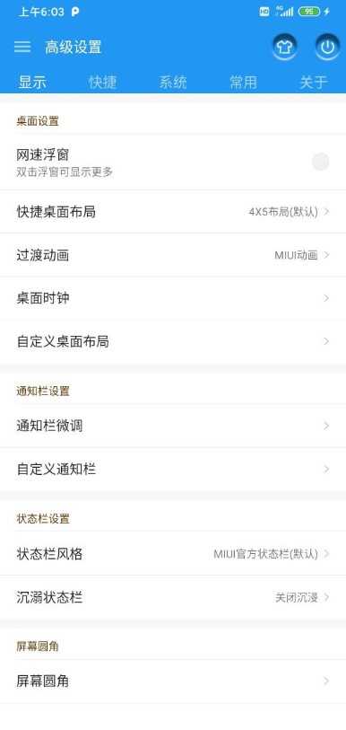 通知栏相关定义如下:下拉单页快捷功能的数量 | 下拉双页快捷键的行数与列数 | 快捷键的尺寸大小 | 亮度条的尺寸大小 | 通知栏中时间显示的字体大小 | 日期及天气显示的字体大小