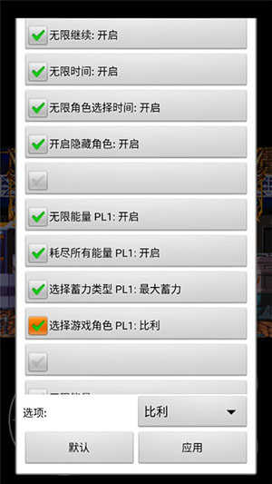4、进入之后,把你想要开启的作弊功能勾选起来,接着点击应用按钮,就能实现金手指作弊。