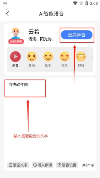 2、在如图所示的文本框位置,输入需要配音的文字。然后点击上方的“更换声音”选项,即可选择不同的声音。