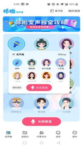 1、第一步,打开哆啦变声器,进入主界面后,映入眼帘的是大量仿真网红音色任你挑选。只要选中你心仪的音色,长按就能开始录音。