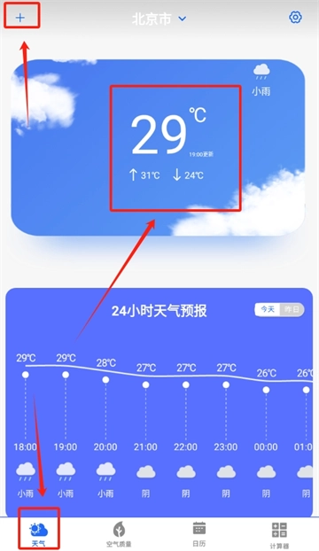 1、进入白云天气预报,在首页左上角可以看到一个小加号,点击这个小加号,就能够开始添加城市天气。