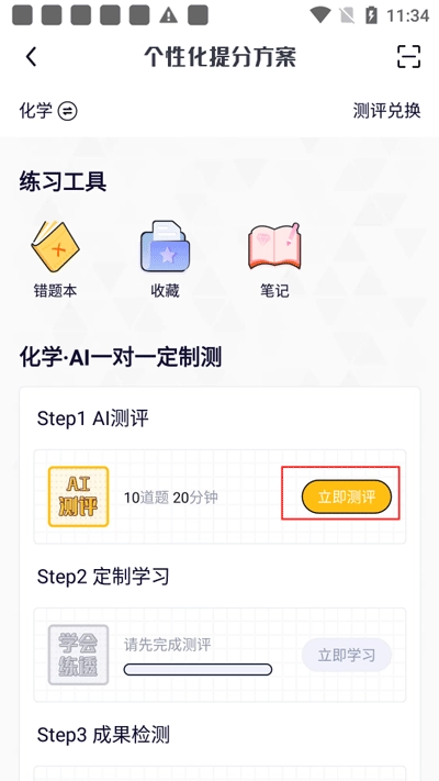 1、进入软件后选中已经购买的测评学科,点击底部【已购买,点击学习】