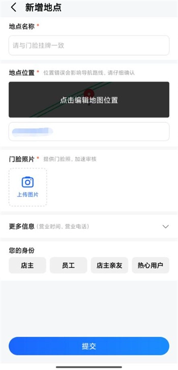 3、请输入新增地点的名称(需与门脸挂牌保持一致)、地点位置(位置若有误,会对导航路线产生影响,请仔细确认)、门脸照片(提供门脸照片,有助于加速审核)以及更多信息(如营业时间、营业电话等)。完成上述操作后,选择您的身份,然后提交,等待审核即可。