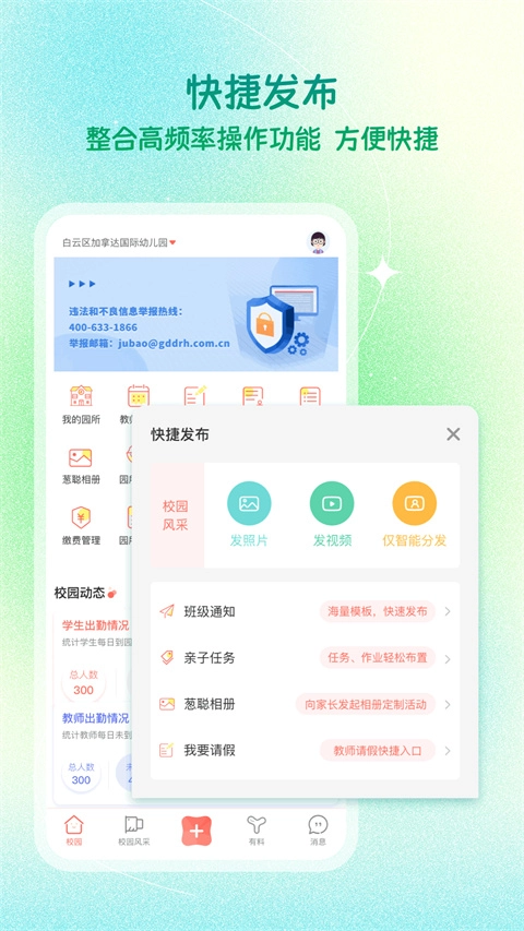 葱米家长版,这是一款专门面向孩子家长打造的幼儿园教育服务软件。它具备极为强大的功能,能够助力用户实时知晓孩子在园状况。孩子于学校的一切信息,无论是清晨接送孩子上学的校车及接送人员,还是中午食堂的午餐内容、明日菜谱等,家长皆可借助该软件直接查看,从而让家长安心。不仅如此,此软件还能实现家长与幼儿园的实时沟通,家长若有任何意见或问题,都能通过软件及时交流并解决。幼儿园发布的各类公告,也能在软件上呈现。此外,在软件中还能完成孩子与家长的认证,每次接送时,依据软件提前设定的家长名单,通过刷脸方式接送孩子,进一步保障孩子的安全。