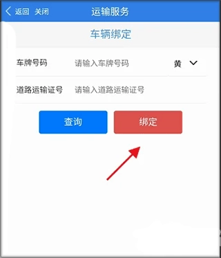7、进入运输服务板块,找到车辆绑定选项,在相应位置输入车辆号码以及道路运输证号,最后点击下方的“绑定”按钮,即可完成操作。
