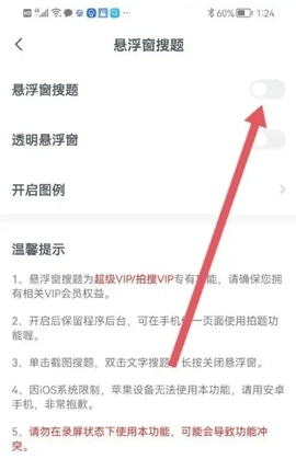 然后把【悬浮窗搜题】的按钮开启即可。