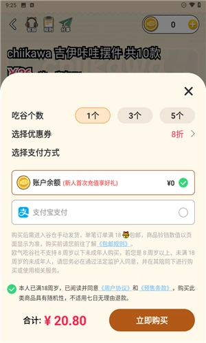 欧气吃谷社作为一个聚焦二次元商品的线上购物平台,集合了各式各样的商品种类,像高达、手办、毛绒玩具、海报、潮玩以及盲盒等等,致力于为用户构建一处一站式的周边采购乐园。该平台运用别具一格的抽选购买方式,使每一回购物都满是期待与惊喜,从而营造出更具趣味、更显个性化的消费感受。