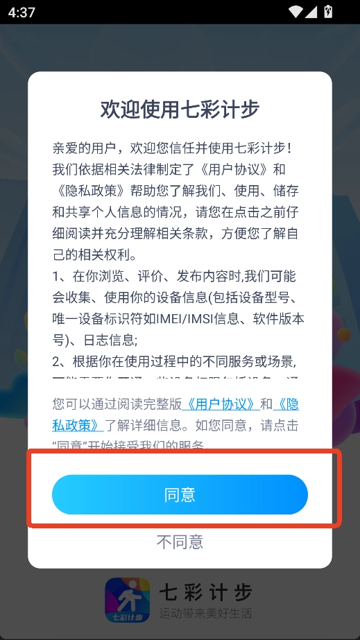 同意后,用户就可以开始使用七彩计步了