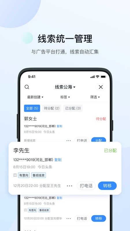 产品亮点:打通广告与客户的连接链路,助力投放效果优化,同时融合客户再营销手段,进一步提升广告投放成效。支持一站式线索管理,有效提升处理效率——广告投放过程中获取的表单提交、电话咨询、在线沟通等各类销售线索将被集中汇总,实现统一管理,不仅能便捷地完成线索分发,还配备了严谨的权限管理机制,全方位保障用户数据安全。