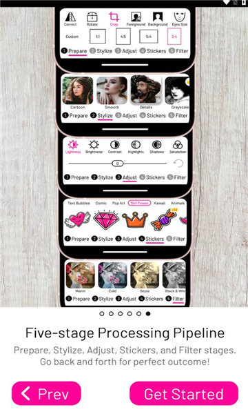 准备阶段配备了多种基础及进阶的艺术照片编辑工具,能让你对风格化阶段的输入内容进行调整。