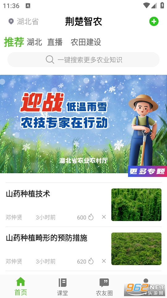 提供农业种植技术培训、专家指导、在线教育、病虫害防治、育种、植保、营养等全方位服务,助力农户提升种植技能与产量。农户可在此分享种植经验、交流市场信息,营造互助合作的良好氛围。针对湖北地区农业特色产业开展定制化服务,更贴合当地农户的实际需求。