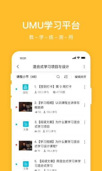 UMU是讲师的教学得力助手,助力讲师通过模块化方式轻松打造课程,真正实现【人人可教】的理念。