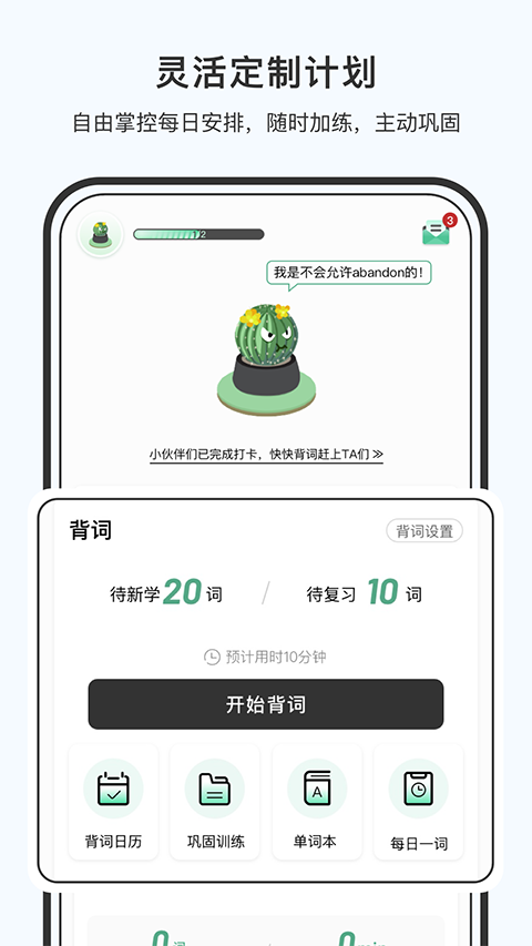 可以自由规划每日的学习目标,系统会定时提醒,再也不用担心忘记任务,坚持今日事今日毕。背单词有科学的计划安排,助力考试顺利通关!