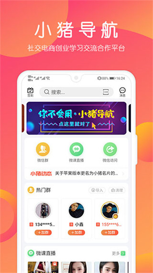 小猪导航最新版是一款专门面向微商营销打造的社交电商综合服务平台软件,它为广大微商用户配备了相当强大的功能,能够协助用户解决一系列难题。借助小猪导航最新版,用户不仅可以便捷地发布自己的产品,还能学习到各类运营与销售技巧,堪称每一位微商都不容错过的强大导航工具。