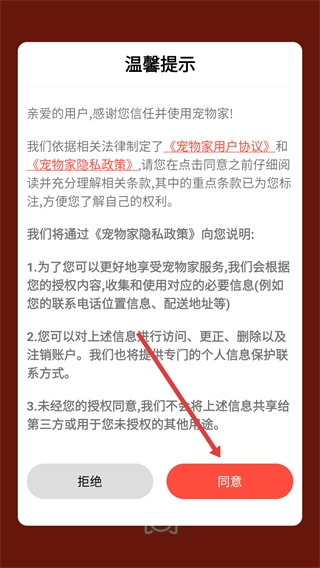 请您先阅读【宠物家用户协议】与【宠物家隐私政策】,在了解其中关于信息的相关条款后,点击【同意】按钮,即可进入账号的登录或注册界面。