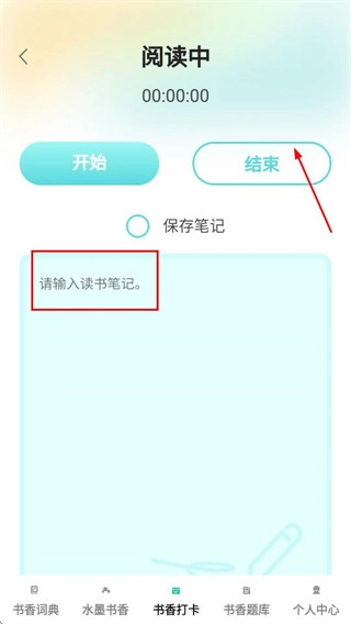 在阅读页面,输入笔记后点击结束按钮,即可完成本次读书打卡。