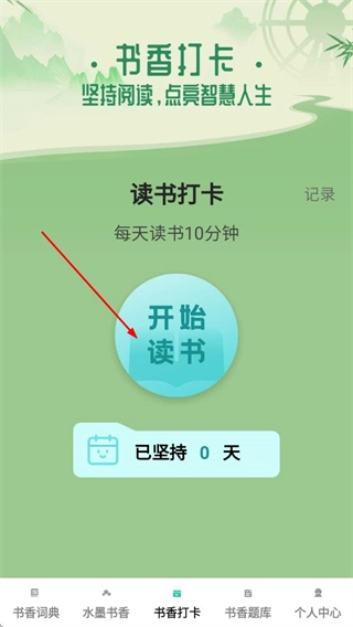 在书香成语首页,点击底部的书香打卡选项,进入读书打卡页面。
