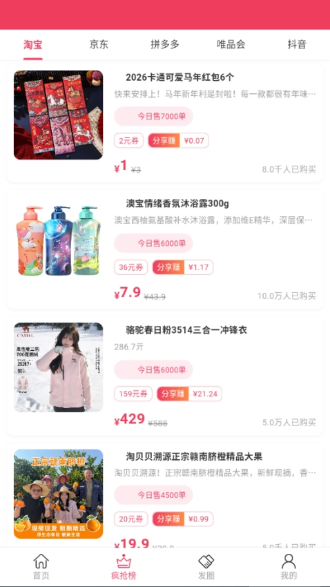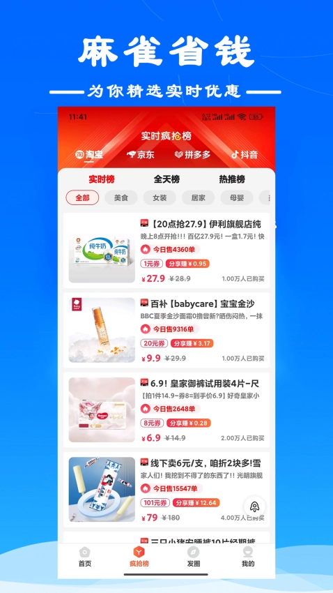 平台打造实时动态的优惠信息与激励生态,每日不定时推送各类优惠线报和“疯抢榜”;并且搭建了“分享赚钱”与“购物返利”并行的双重激励体系。