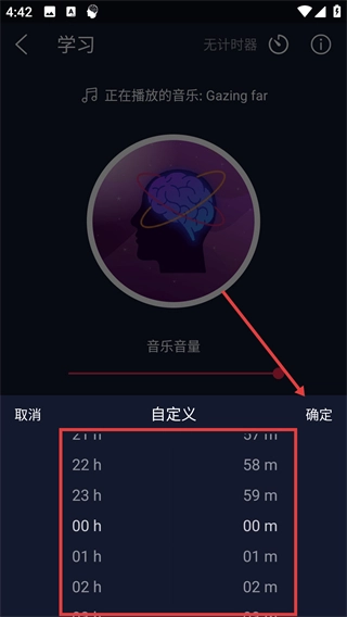 进入【学习】功能页面后,能够对【音乐音量】和【波音量】进行调节,点击播放按钮即可启动音频,与此同时还可以通过操作【无计时器】按钮来设置时长。