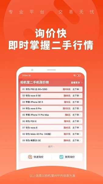 拍机堂是一款专注于二手商品交易服务的软件,平台上的二手商品涵盖丰富品类,尤其是各类数码产品一应俱全。所有商品在上架前都会经由专业人员进行全面检测,从外观成色、性能运行到电池健康状态等多个维度展开评估,以确保商品不存在质量隐患。平台采用无中间商的模式,直接对接买卖双方,保障交易的公平性。用户也能在此平台出售自己的二手物品,借助的估价功能,可实时了解市场行情,获取合理的参考定价。