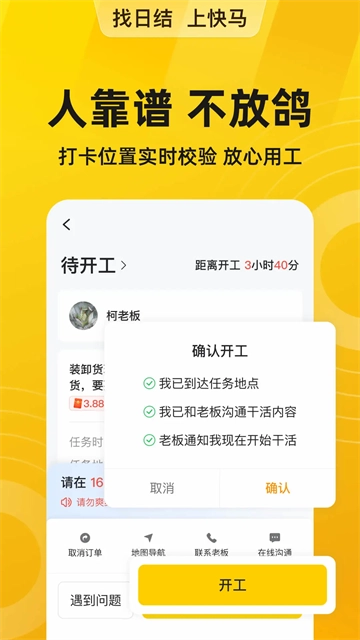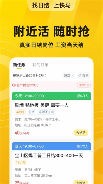 快马日结是一款以工资日结为核心的手机招工应用,平台上大量岗位提供日结薪资,附近的工作机会可随时抢单,无需担忧完工后薪资拖欠等问题;若您有招工需求,也能直接在平台发布信息。此外,快马日结配备实时通讯功能,有效提升了招聘与服务的效率,便于工人和企业随时进行沟通,尤其适合临时用工人群。