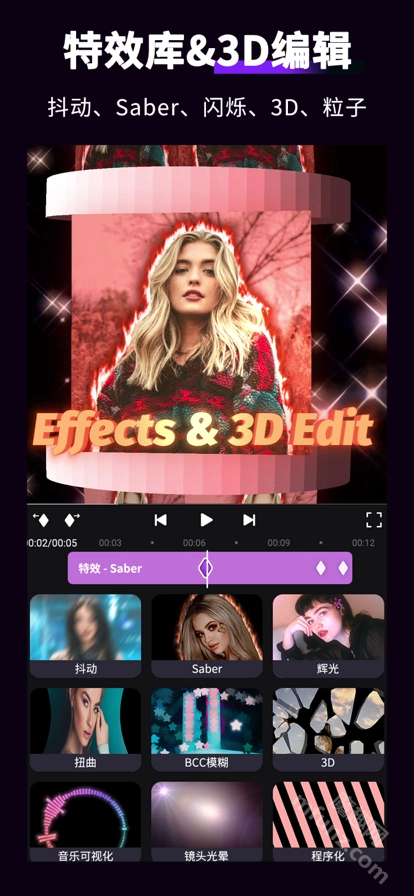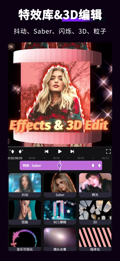4、特效丰富多样:包含火焰、激光、狂风等动态特效,支持一键添加。