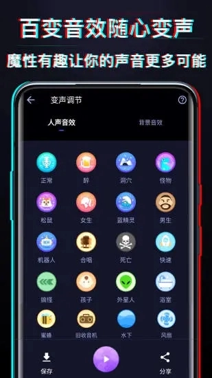 变声器:打造更轻松愉悦的交友与社交聊天氛围,语音包、变声必备的人声音效和背景音效都能自由使用。