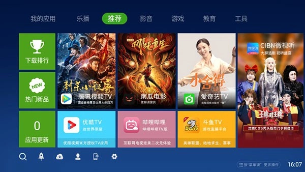 安装奇珀市场后,打开它就能在里面找到我们需要的各类电视软件,像电视直播、点播以及游戏类软件,具体比如优酷、腾讯视频、芒果TV等等。