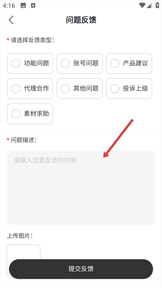 在我的客服页面,点击“提交反馈”选项,进入问题反馈页面。