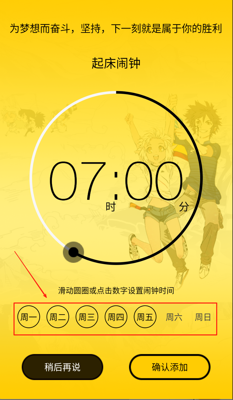 在闹钟编辑页面,你可以拖动时间选择器来设置小时和分钟,另外还能选择周一到周日的重复日期。