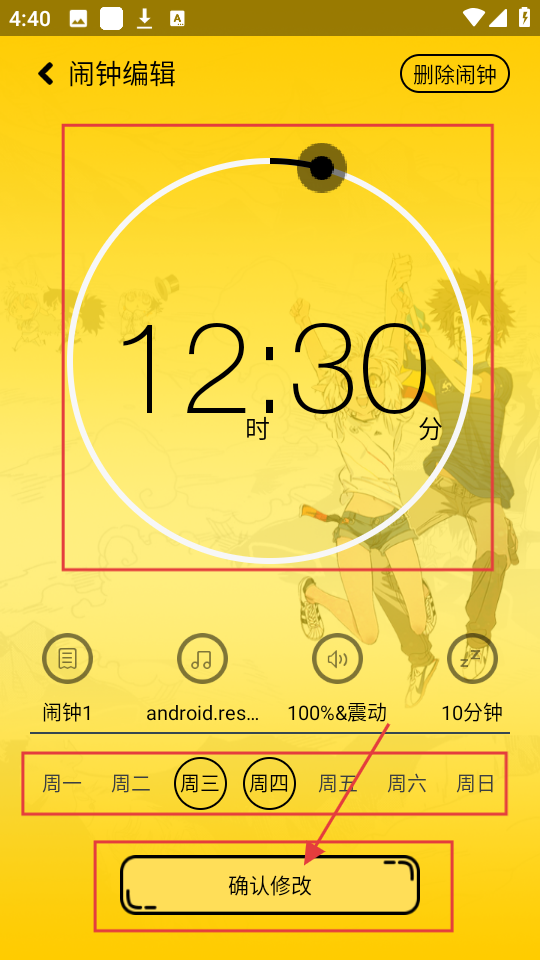 把时间设置成【12:30】,再把【周三】和【周四】这两个重复日期勾选上,然后点击【确认修改】按钮就可以啦。
